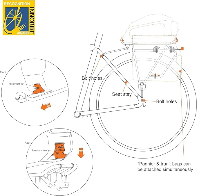- Allow to use IBERA Trunk bags (IB-BA11, IB-BA14, IB-BA15, IB-BA22) and most universal strap-attached panniers