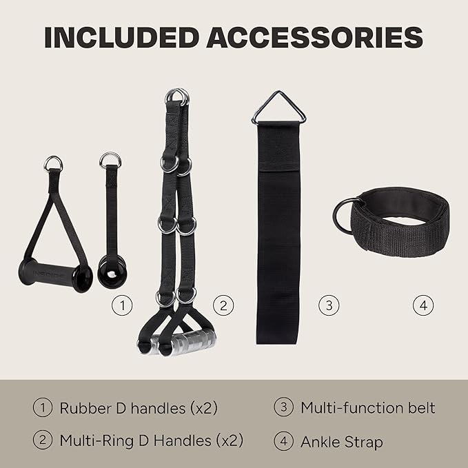 - INCLUDED ACCESSORIES: 2 x Multi-Ring D Handles, 2 x Rubber D Handles, Ankle Strap, and Multi-Function Belt