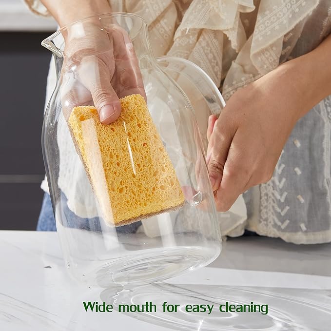 - [Elegant Design] This glass pitcher is handmade and has an elegant shape. It is designed with a large handle for comfortable grip.