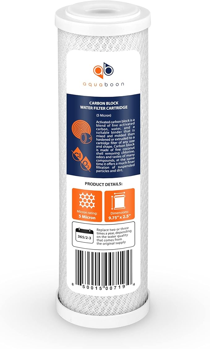 - Ultimate Purity with Activated Carbon: Aquaboon’s carbon water filter is made from high-purity coconut shell activated carbon. This 10 x 2.5 water filter effectively removes chlorine, chemicals, and bad odors, providing fresh filtered water.