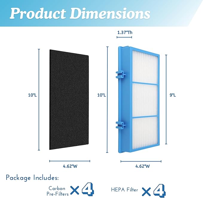 - Dimension: 1.2 x 10 x 4.6 inches. 4 HEPA + 4 sheet of carbon pre filter included.
