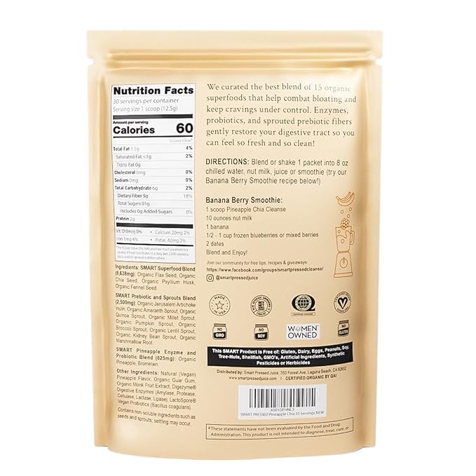 SMART Pressed Juice Pineapple Chia Cleanse | Prebiotic Superfood Plant Based Fiber with Vegan Probiotics & Enzymes | Pineapple Juice Cleanse for Women & Men | 30 Servings