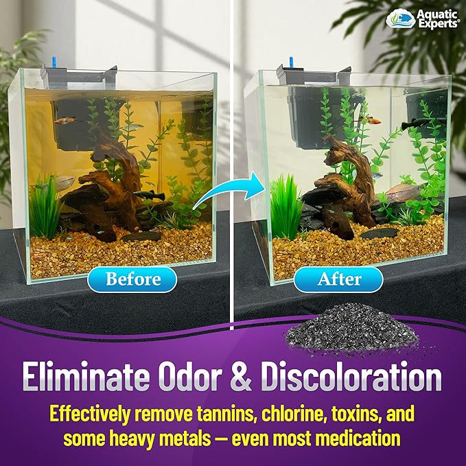 - ELIMINATES ODOR AND DISCOLORATION! Our activated carbon, also known as activated charcoal, removes foul odors from freshwater and saltwater aquariums and even pond water LEAVING A CRISP CLEAN SMELL. Our aquarium charcoal has large internal surface area which rapidly adsorbs dissolved pollutants from water including yellow-brown tint, toxins, chlorine, most medications, and some heavy metals.