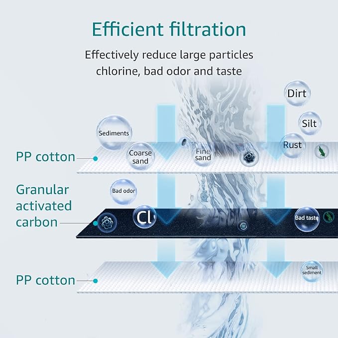 - Efficient filtration: whole house water filter adopts food-grade polypropylene to reduce large particles and sediments larger than 5 microns in diameter effectively, and the 1-micron rating to reduce contaminants like chlorine, taste and odor. The granular activated carbon is made from natural coconut shells.