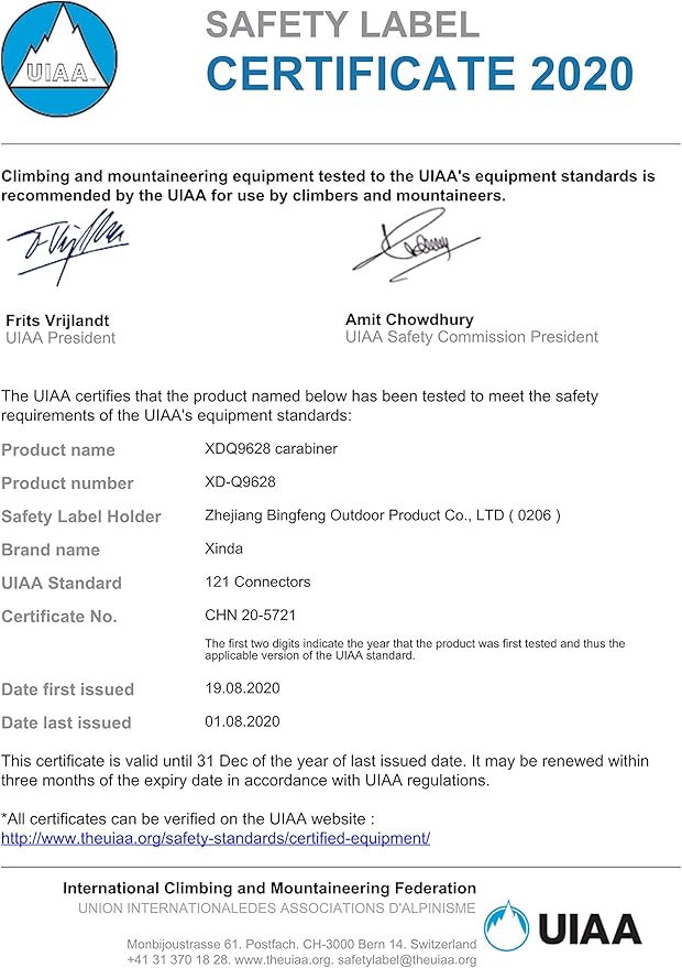 - Heavy Duty Carabiner: Major axis: 25KN (5500lbs), Minor axis: 8kN, Open gate: 7kN, CE/UIAA certified.(Tips:The rating on the carabiner is a result based on the lab test,which might vary in practice.)