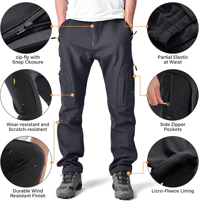 - Winter hiking pants men: 5 Secured Zipper Pockets can keep your phone, wallet, key, tactical gears or other accessories for ultimate safely, convenience and efficiency while moving. Freedom of movement - Stretch Spandex Softshell Pants featured with articulated knees provides great flexible.