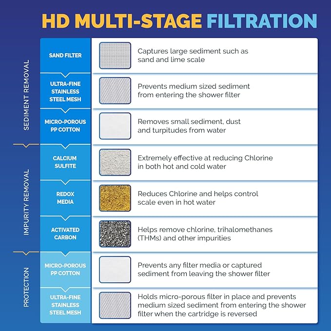 - Hair You Can’t Stop Touching - Frizzy & Falling to Naturally Silky Soft & Thick: AquaBliss water filter for shower leverages a proprietary blend of ultra-dense redox media, 2x strength calcium sulfite (strips, not cheap beads) and coconut shell activated carbon to quickly, easily and naturally reduce those nasty hair & scalp disrupting agents, without reducing water pressure. The ideal well shower head filter to support thick, silky soft hair you can’t stop touching.