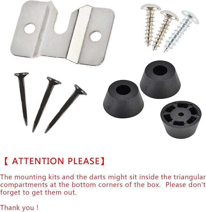 - 4 complete sets of high quality 18g steel darts with high quality shafts and flights. Dartboard mounting kits are also included. (Please check the bottom corner of the box for all accessories)