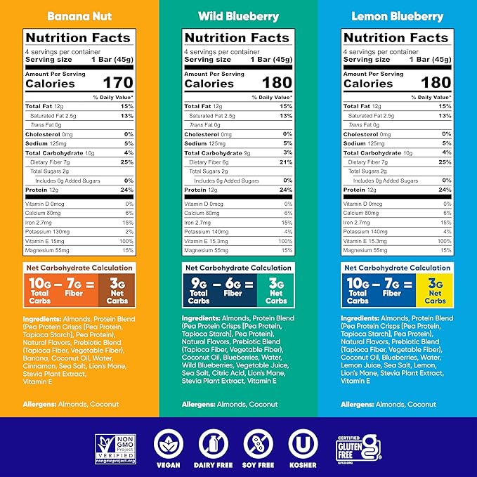 - KETO FRIENDLY SNACKS w/ Only 3g Net Carbs in Every Serving - Net carbs are carbs that are absorbed by the body, and our keto treats come with only 3g of net carbs in every serving. Each keto plant based protein bar is packed with 9-10g of total carbs, 6-7g of fiber, 12g of fats & 170-180 calories. Enjoy our 3 flavors Lemon Blueberry, Banana Nut, Wild Blueberry