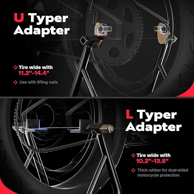 - ADAPTABLE FORK HEAD - Our motorcycle rear stand features a U-shaped fork head support with an adjustable range from 11.2 to 14.4 inches; For flexibility, we offer two L-shaped fork heads, allowing for adjustments between 10.2 and 13.6 inches; These customization options ensure solid support from all sides, making the stand suitable for various types of motorcycles; Verify motorcycle compatibility before buying, we recommend using matching stand screws for optimal fit