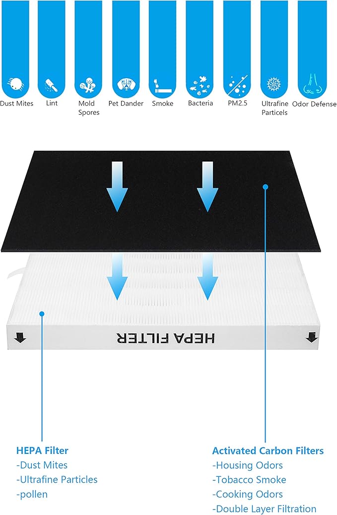 - 【ODOR ELIMINATOR】- Activated carbon filter helps reduce unwanted odors from pets, smoke, cooking fumes, and harmful VOC's emitted from a variety of household products and chemicals.