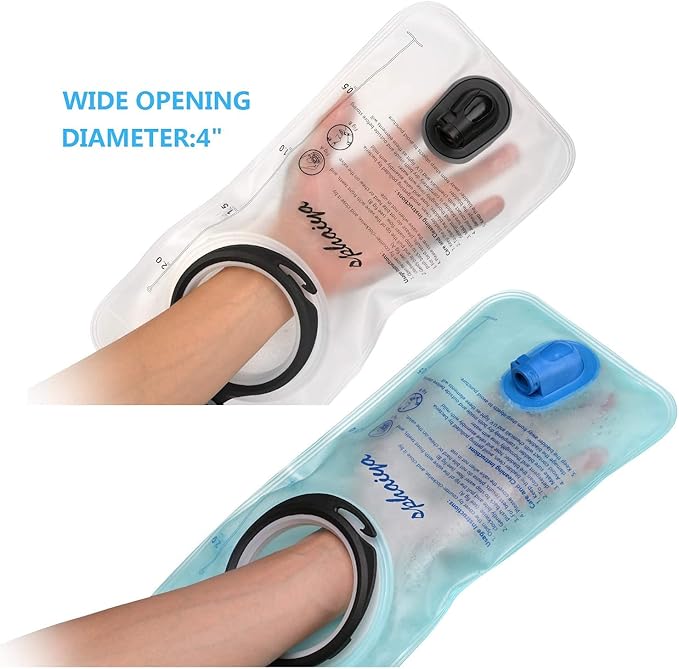 - Capacity:2Liter (70oz),Hydration Bladder L 15'' x W 6.8'' , tube (0.4" diameter, 38" long),Blue Hydration Bladder x 1,White Hydration Bladder x 1, Clean Flexible Brush x1