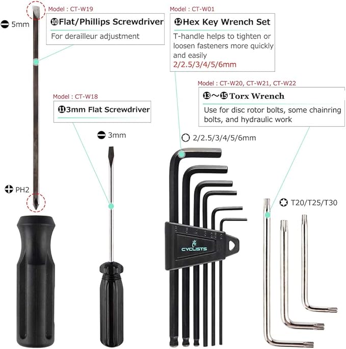 - 【High Quality Material】: Major in bike accessories more than 10 years, we know a lot about cycling products, this bike tool set made in Taiwan - world excellence of cycling products. This tool set with premium carbon steel and high quality plastic tool construction ensures durability and strength.