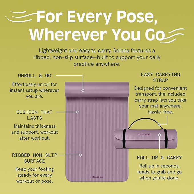 - EXTRA THICK FOR COMFORT & BALANCE: Solana firm 1-inch extra thick fitness mat w/ mat strap alleviates stress on pressure points such as joints, hips, hands, and knees. Solana measures 72" X 24" X ½".