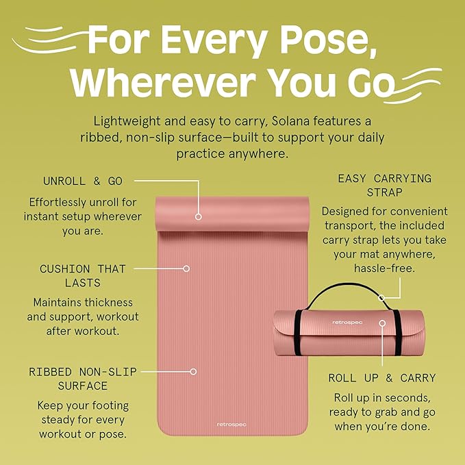 - EXTRA THICK FOR COMFORT & BALANCE: Solana firm 1-inch extra thick fitness mat w/ mat strap alleviates stress on pressure points such as joints, hips, hands, and knees. Solana measures 72" X 24" X 1".