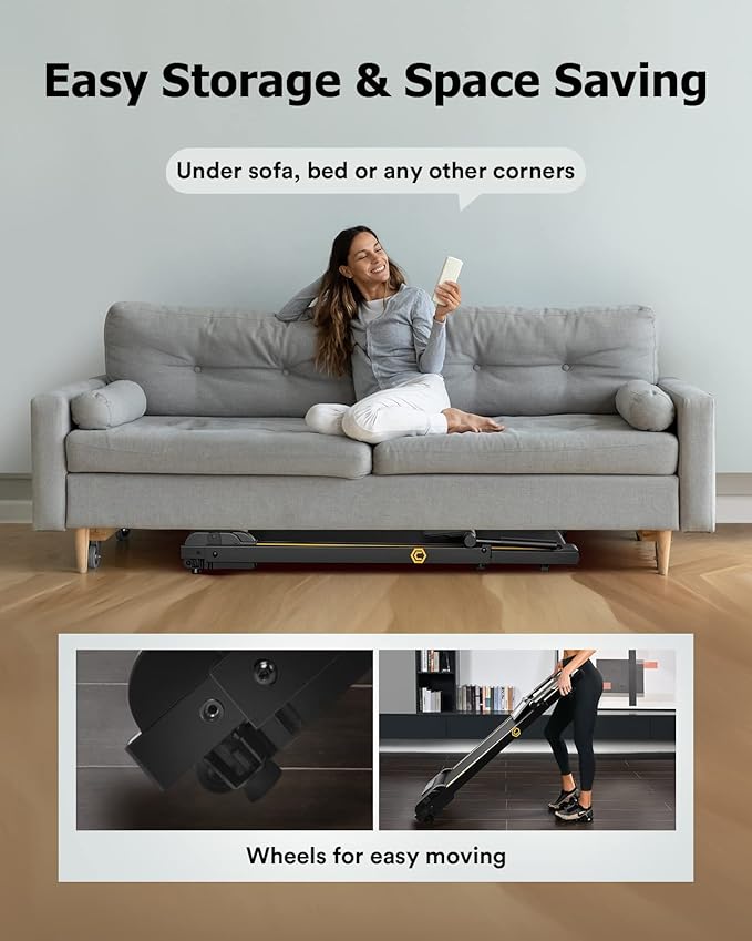 - Easy-to-Fold Design to Improve Space Utilization: Folding it in only one step! The folding size is 48x26x5.5 inches (L x W x H). The compact design also makes it easier to store anywhere, even under the bed or sofa, taking up minimum space. UREVO new folding treadmill is now smaller and more convenient, weighing only 22.5kg.