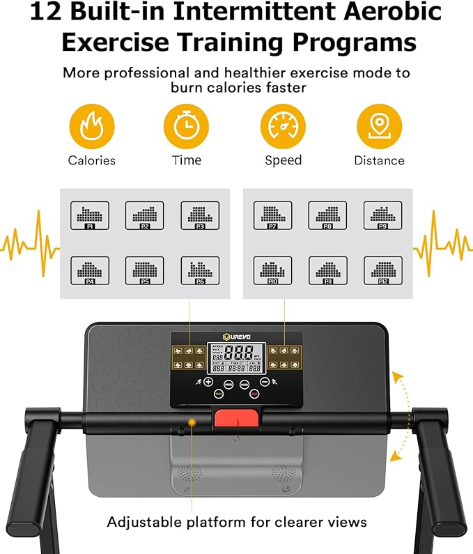 - Most Effective Running Modes of Reducing Fat: HIIT is internationally recognized as the most effective method of reducing fat. To burn calories more effectively, we specially programmed 12 different HIIT running settings, with the help of these preset training plans, you can choose the best plan to suit your needs. Also, the adjustable LCD platform will keep track of your exercise data, such as speed, time, distance and calories.