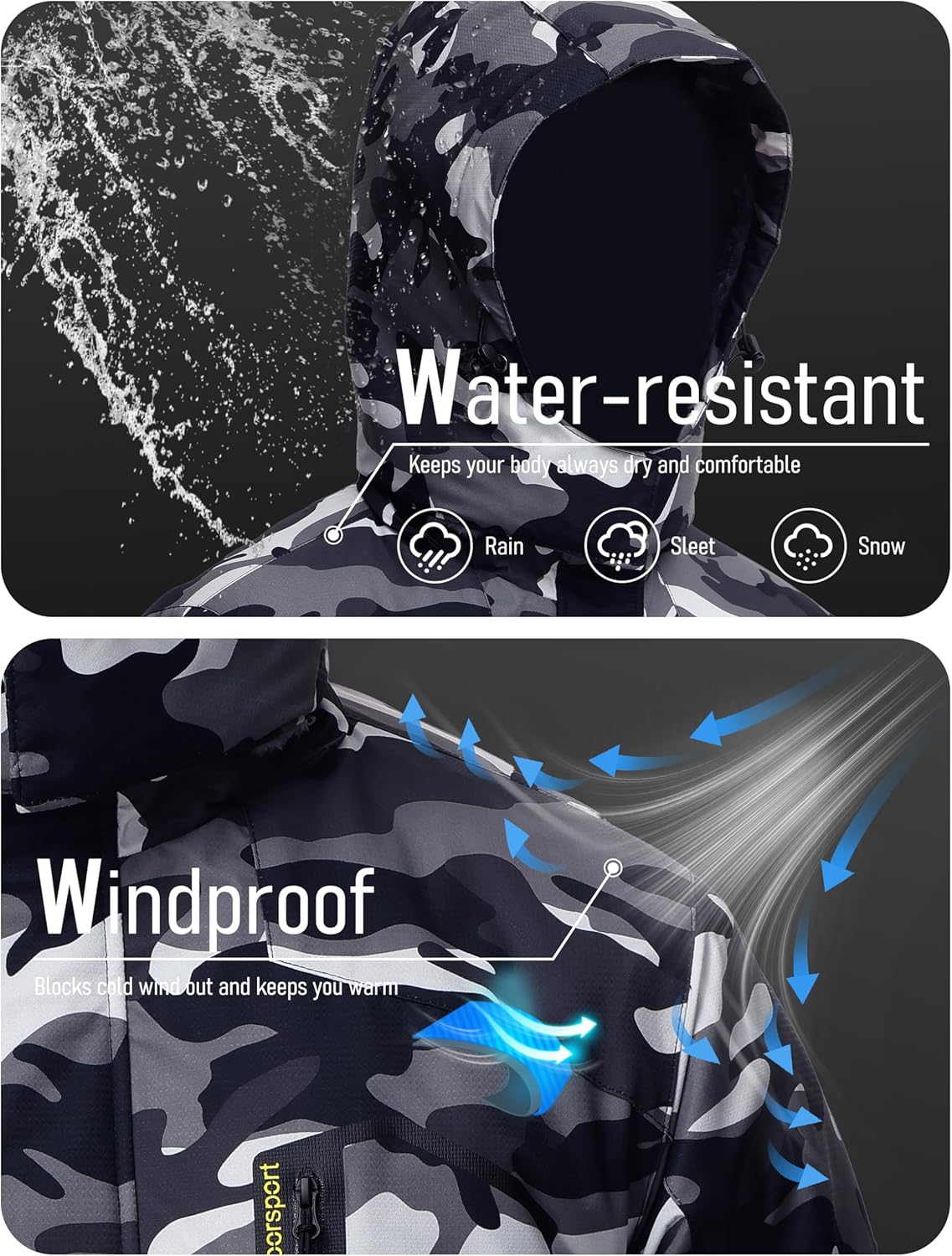 • Water repellent: Professional water repellent jacket, keep your body always dry and comfortable, you won't worry about getting wet while skiing, snowboarding, hunting, hiking in inclement weather.