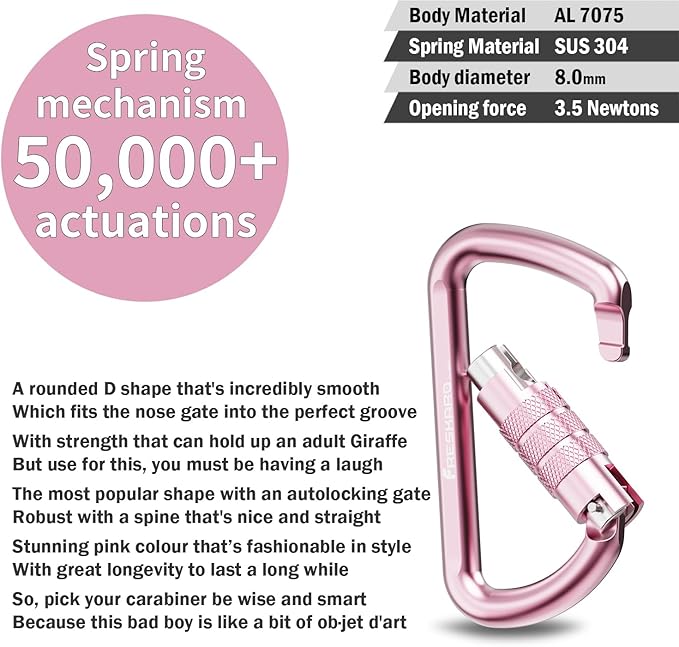- 【SAFE TO USE】- With the auto lock, you don’t need to worry you would lose your keys or belonging; it’s a very strong carabiner (12kN/2698lbs), and you don’t need to worry about hanging a heavy hammock chair or other heavy staff