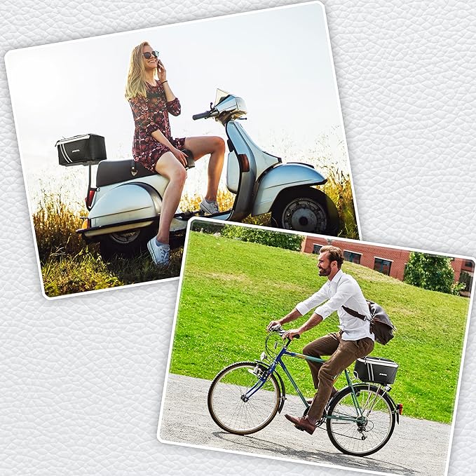 - INSULATED BIKE COOLER BAG: The design of aluminum foil insulated inner helps keep food & drinks cold/warm for hours; This trunk attaches easily to the rear bike/e-bike rack with 2 velcro straps. It could collapse flat when you don’t use it.