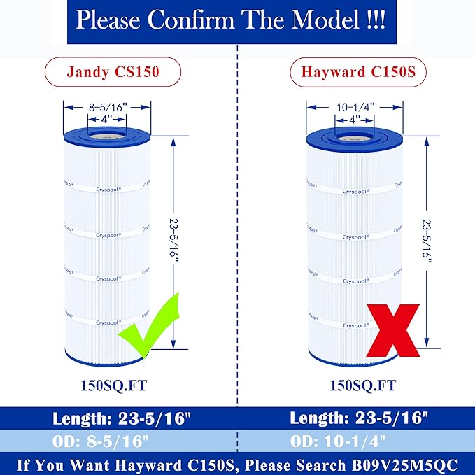 - 【COMPATIBLE MODELS】Compatible with Jandy CS150, R0462300, PJANCS150, X-Stream CC1500, CCX1500RE, C-8414, FC-1287, Clearwater II 150, Pro Clean 150, SD-00371, Clear Plus C1502, CX1520RE, pro clean 150 and 817-0150N(models after 2006 ). Note: The manufacturer’s name and part number have been used for reference purposes only. CRYSPOOL is an independent brand.