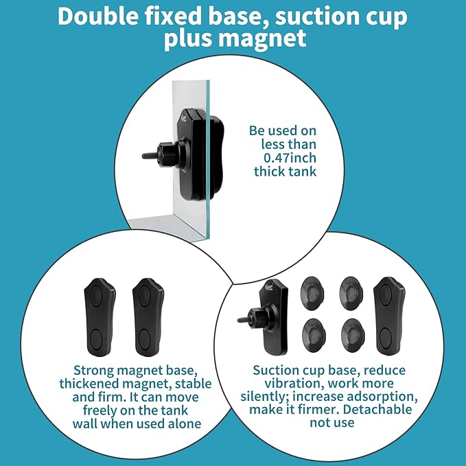 - DOUBLE FIXED BASE: Suction cup base, reduce vibration, work more silently; increase adsorption, make it firmer, detachable not use. Strong magnet base, thickened magnet, stable and firm, it can move freely on the tank wall when used alone. Be used on less than 0.47 inches thick tank