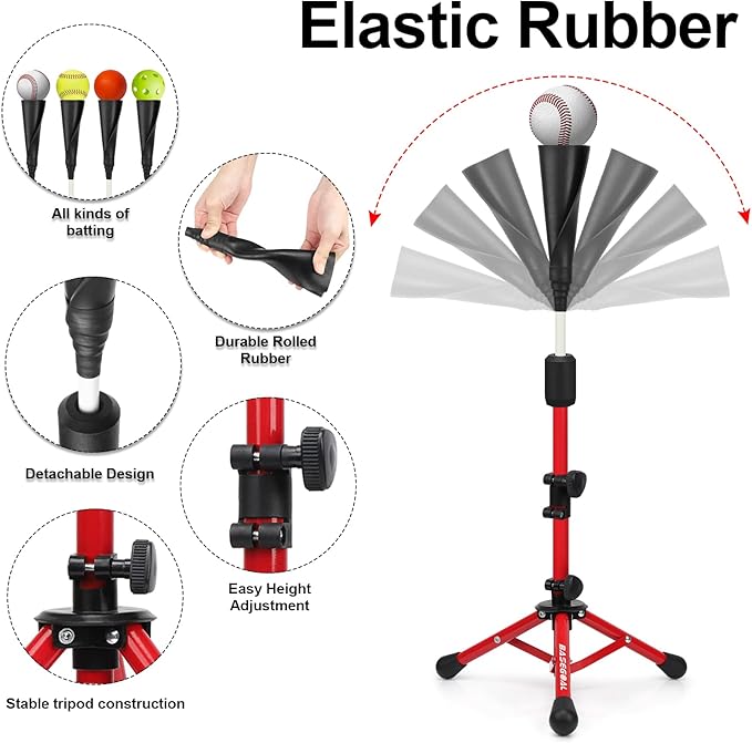 - 3.【DURABLE-HIGH QUALITY WRAPPED RUBBER】Youth Hitting Tee,Every BaseGoal Tee top is hand rolled,Strong and durable,Which is suitable for kinds of balls, with good elasticity, like baseball, softball, training ball and to have the real hitting feelings with special size design.