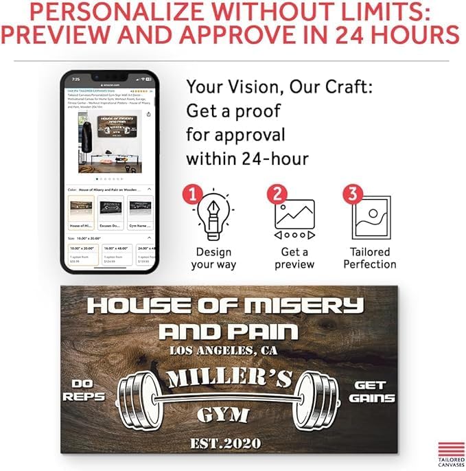 - You get a Preview with a Lifetime Warranty - Check your Personalized Gym Sign Wall Art Decor sent by our Quality Control Team within a day via Amazon Messaging; Love it or We'll make it right for you, no questions asked! Click "Customized Now" & Lets turn your Ideas into Reality!