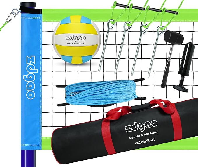 Outdoor Portable Volleyball Net System - Adjustable Height Poles with Soft Volleyball Ball, Pump, Hammer, Boundary Line, and Carry Bag for Backyard, Beach, Lawn