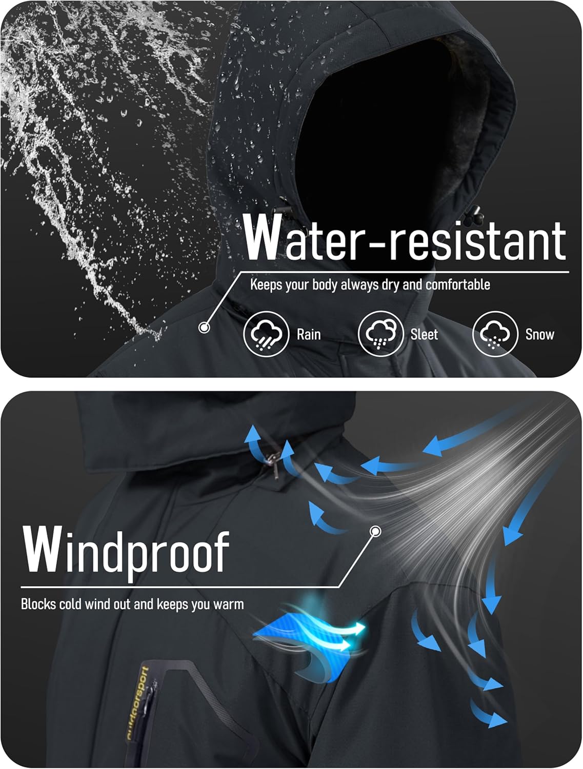 - Water repellent: Professional water repellent jacket, keep your body always dry and comfortable, you won't worry about getting wet while skiing, snowboarding, hunting, hiking in inclement weather.