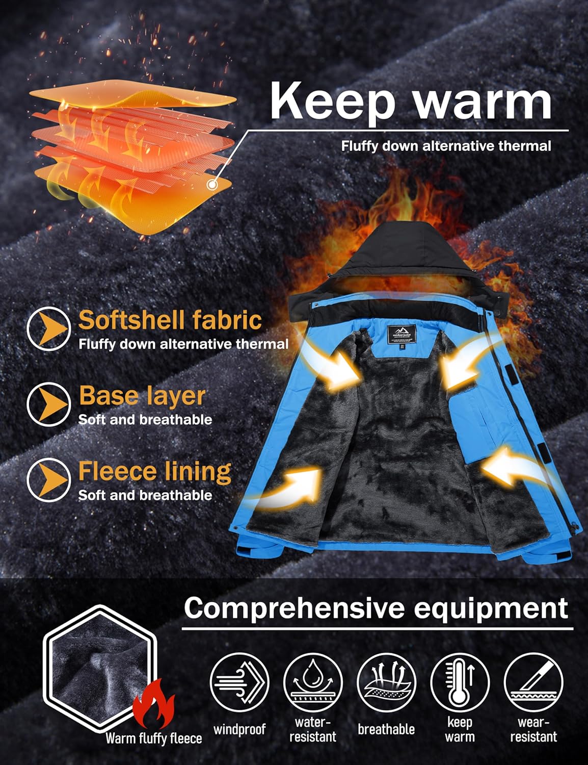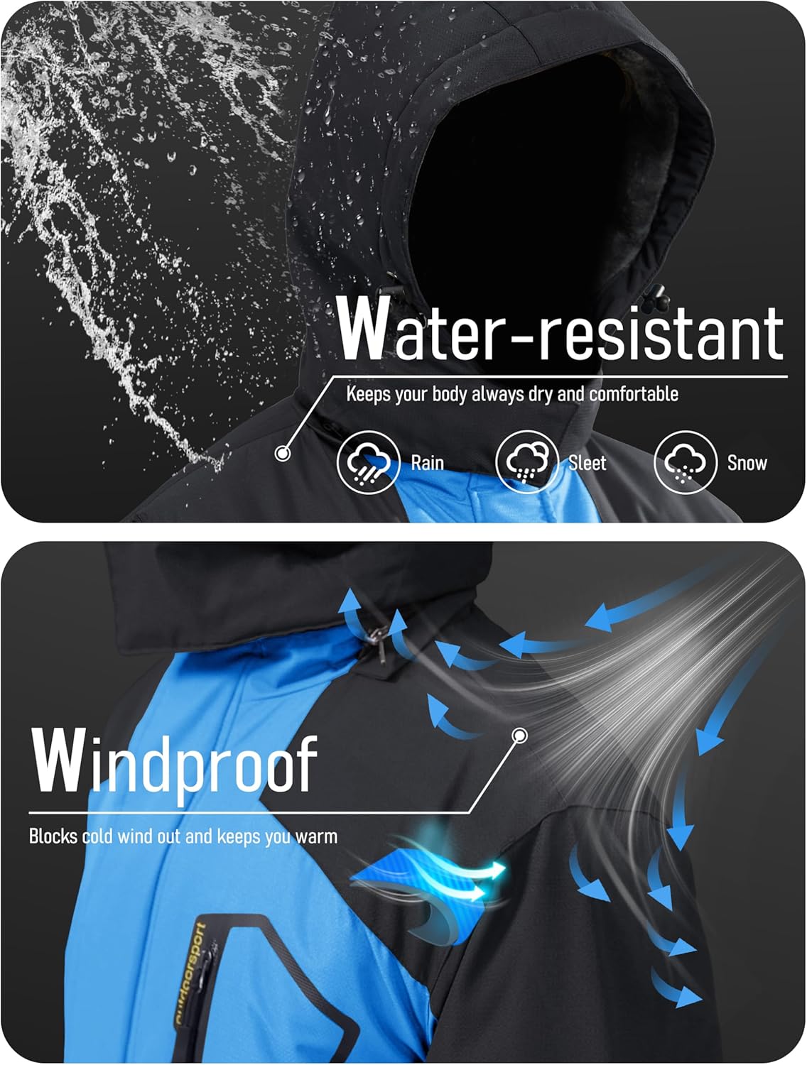 • Water repellent: Professional water repellent jacket, keep your body always dry and comfortable, you won't worry about getting wet while skiing, snowboarding, hunting, hiking in inclement weather.