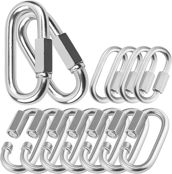 - Suitable for Indoor and Outdoor Activities—The locking quick link carabiners are versatile accessories used in many applications, great fast link for pets, fitness equipment, fence gate, swing, hammock, pet dogs, and DIY accessories, outdoor uses like camping, fishing, shade sails and carabiners