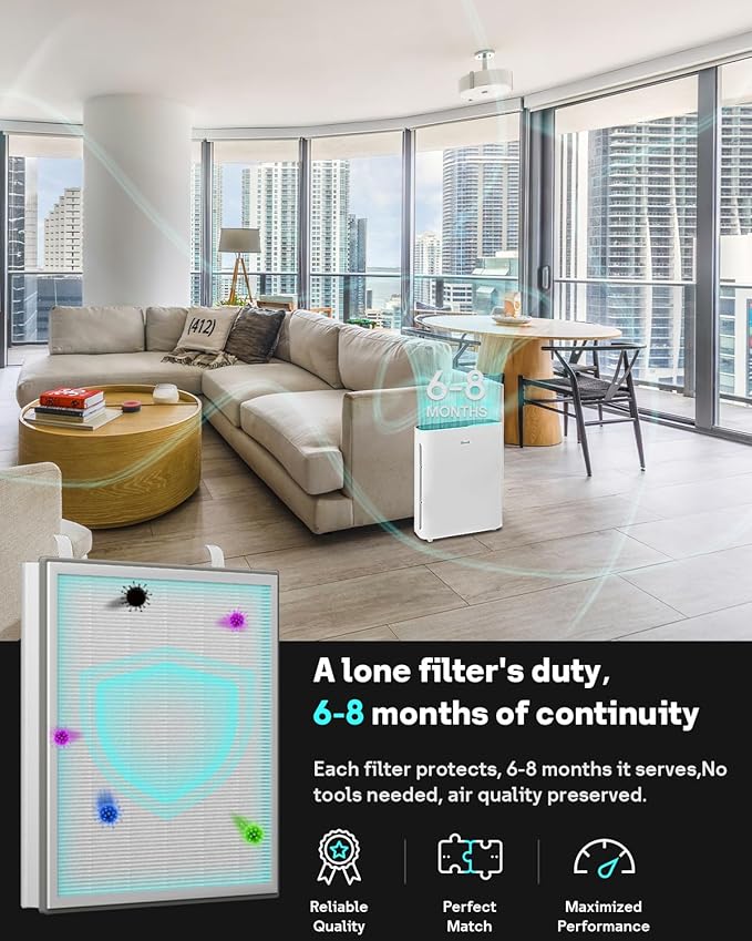 - OPTIMAL REPLACEMENT SCHEDULE: To keep your air purifier at peak performance, we recommend replacing the pre-filter every 3 months and the HEPA filter every 6-8 months, depending on the air quality in your area and the use of the air purifier