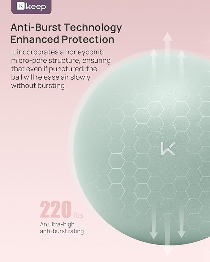 - Anti-Bust & Worry-Free -- The KEEP Fitness Ball features anti-burst technology with a honeycomb microporous foaming structure. It has passed strict explosion-proof test, with an ultra-high anti-burst rating of 1300 lbs. In the event of puncture by sharp objects, the ball deflates slowly rather than bursting, ensuring your safety is always protected