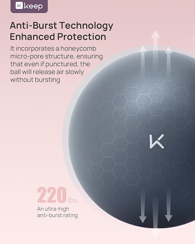 - Anti-Bust & Worry-Free -- The KEEP Fitness Ball features anti-burst technology with a honeycomb microporous foaming structure. It has passed strict explosion-proof test, with an ultra-high anti-burst rating of 1300 lbs. In the event of puncture by sharp objects, the ball deflates slowly rather than bursting, ensuring your safety is always protected