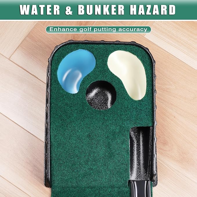 - Hazard Putting Mat: bunker and water hazard help increase putting accuracy.premium mat prevents the mat from moving and give you a sports experience. Its compact design & lightweight structure makes it easy for you to carry it. Easy assembly and set up means that you can start playing in a jiffy!