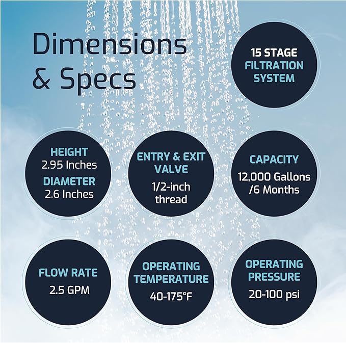 - [Long-lasting] - For best filtration results, each filter cartridge should be replaced every 6 months or after 12,000 gallons. Our hard water filter for shower head cartridge has a Flow rate of 2.5 GPM. The water filter for shower replacement operates at a temperature of 40-175F, and pressure of 20-100 psi.