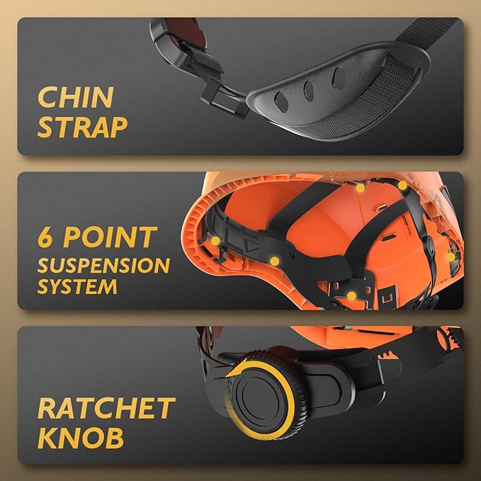 - 【More Humanized Design】Helmet with adjustable 6-point suspension system,Sliding vent holes allow easy opening and closing based on weather conditions ,it is conducive to the reduction of the impact of air circulation, reducing the possibility of safety helmet falling.One adjustable size fits all.Helmet size range from 53-64cm/ 20.86-25.20 inch.