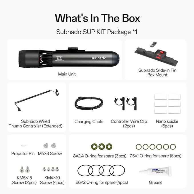 - 【SUBNADO SUP KIT INCLUDES】The updated version replaces the stick-on SUP board bracket with a slide-in bracket, simplifying the optional accessories and better adapting to the paddle board. The Subnado Sup Kit set included Subnado Main Unit*1, Subnado slide-in fin box mount bracket*1, extended wired thumb controller*1, propeller pin, screws and several different sizes of O-rings for spare.