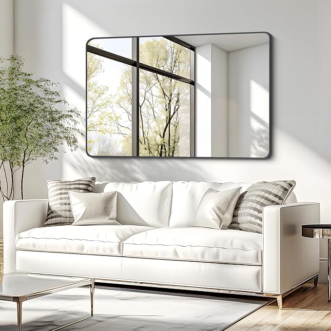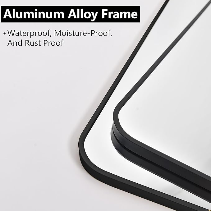 - Excellent Design: Our rounded rectangular wall mirror is designed with a kind of fashion and modern industrial style. The frame is made of brushed black metal with an angled design to protect the mirror. Besides, the black mirror is anti-stripping, anti-cracking and anti-water,and it is safer and more premium than traditional recessed frames.