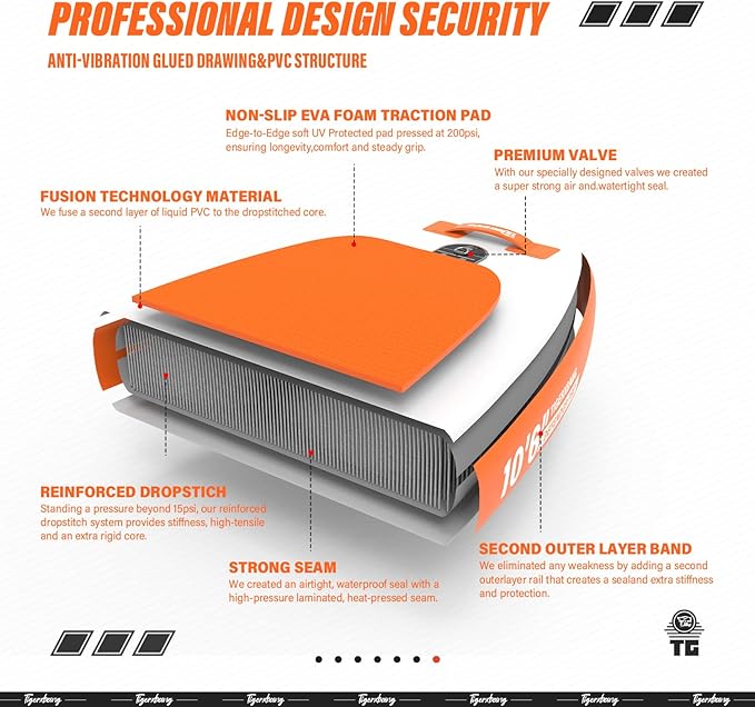 - 【Lighter and More Flexible】The TIGERXBANG Defender Collection inflatable paddle board is made of ultra-light military-grade PVC material, which has excellent wear resistance, toughness, and a long service life. With a size of 10' x 31" x 6", the paddle board is lighter, more portable, and easier to operate, allowing paddlers to navigate various complex water flow environments with more flexibility.