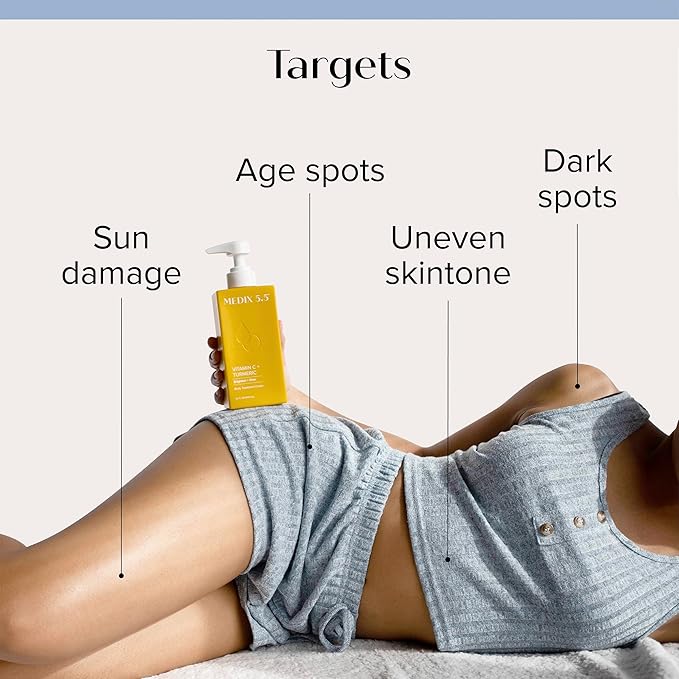 - EFFECTIVE INGREDIENTS – Medix 5.5 Vitamin C Cream Brighten + Firm Body Lotion is formulated with the perfect combination of effective brightening + anti aging ingredients, including Shea Butter, Aloe Vera, Ferulic Acid, Turmeric, Vitamin E, Glycerin, Ginger, & More. Shea Butter deeply moisturizes the skin, improves elasticity, & provides a protective barrier to help prevent moisture loss. Vitamin E helps protect skin against free radicals + UV Damage. Aloe Vera helps calm + hydrate the skin.