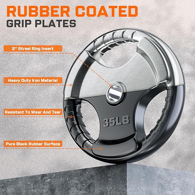- EASY GRIP – The Olympic weight plates is designed with three holes and there are grooves in the grip holes for easy and safe handling when loading and unloading heavy objects. Descending and lowering after weight training is safer and more practical. The comfortable grip also gives you a good using experience