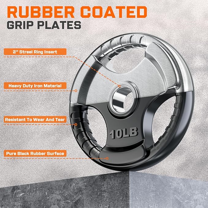 - EASY GRIP – The Olympic weight plates is designed with three holes and there are grooves in the grip holes for easy and safe handling when loading and unloading heavy objects. Descending and lowering after weight training is safer and more practical. The comfortable grip also gives you a good using experience