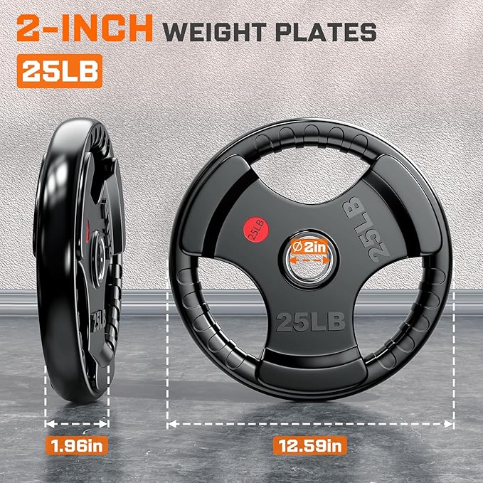 - EASY GRIP – The Olympic weight plates is designed with three holes and there are grooves in the grip holes for easy and safe handling when loading and unloading heavy objects. Descending and lowering after weight training is safer and more practical. The comfortable grip also gives you a good using experience