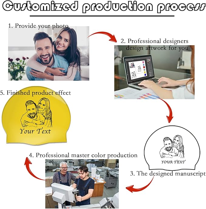 - Customized Swim Cap: Select one of our unique patterns, click "Customize Now"; upload your picture, and input any text you want to design. Your photo will be printed permanently on your swim cap without fading. Please provide a high-resolution picture for better results.
