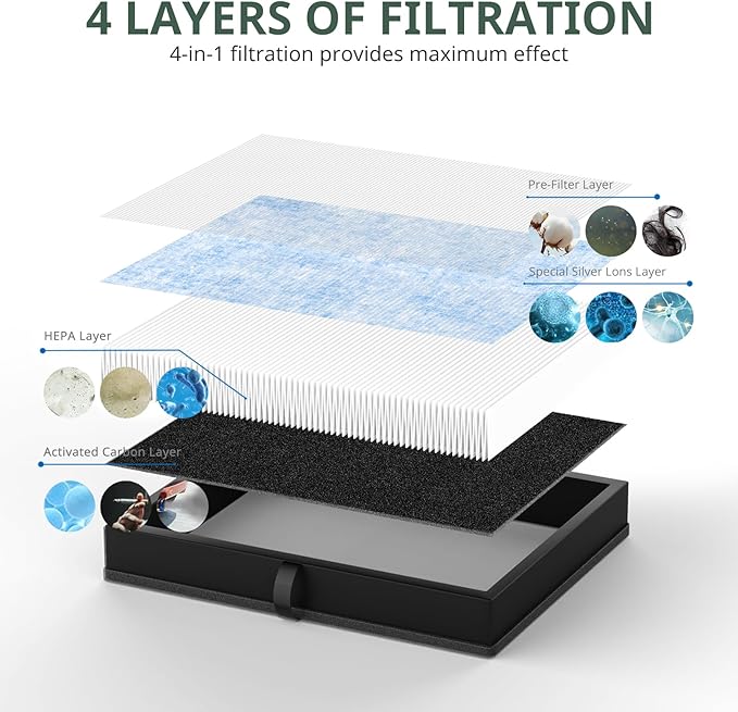 - 【4-LAYER FIL-TRATION SYSTEM】: Our air puri-fiers fil-ter MK-04 is designed with a 4-in-1 High-Efficiency System. Pre-Fil-ter, HEPA Fil-ter, Special Silver Ion Layer, and Activated Carbon Fil-ter. Collect the hairs, dander and others, attach to 99.97% of airborne larger than 0.3 microns, and take in unpleasant odors from smoke, cooking odors, and pet odors, and VOCs