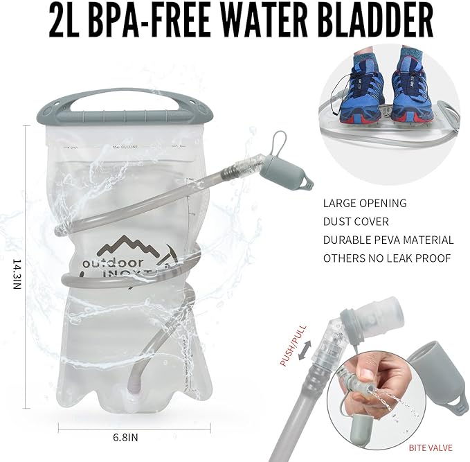 - 🚴【Premium Quality Water Bladder】The Hydration Pack Backpack comes with a 2 liter hydration water bladder and two 250ml soft flask. A switch valve and a cover cap make double leak-proof. Large opening allows quick filling of water and ice and it is easy to clean, the water line (40"length,0.4"diameter) provides a wholesome flow for easy drinking keeps your water tasting fresh, all day. The water temperature is range -20~+50℃.
