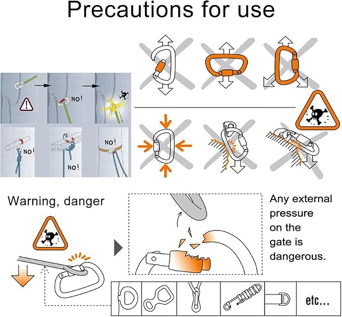 - 【Wide range of uses】This climbing carabiner has a weight limit at 25kN (5620 lbs) for major axis, 7kN cross force, and 7kN from end to end while the gate is open.These aircraft grade aluminum climbing carabiners are great for all activities like rock climbing, ice climbing, rappelling, rescue, swing, aerial yoga, camping and hiking etc.
