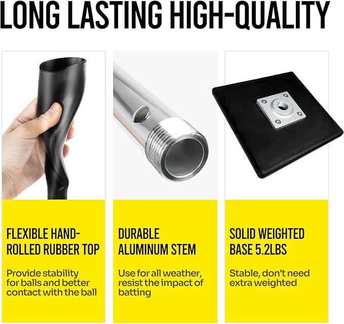 - โพใDurable Batting TeeใThe one-piece baseball tee is made of durable metal and rubber parts. sturdy solid metal base weighs 5.2LB, 9 inches wide can withstand strong impacts and provide stability for every swing, flexible rubber top allows you to make better contact with the ball.